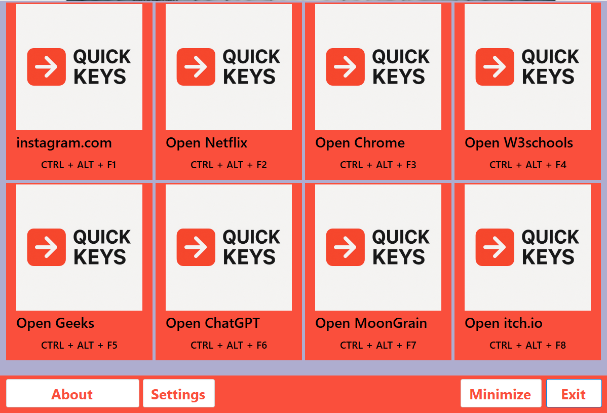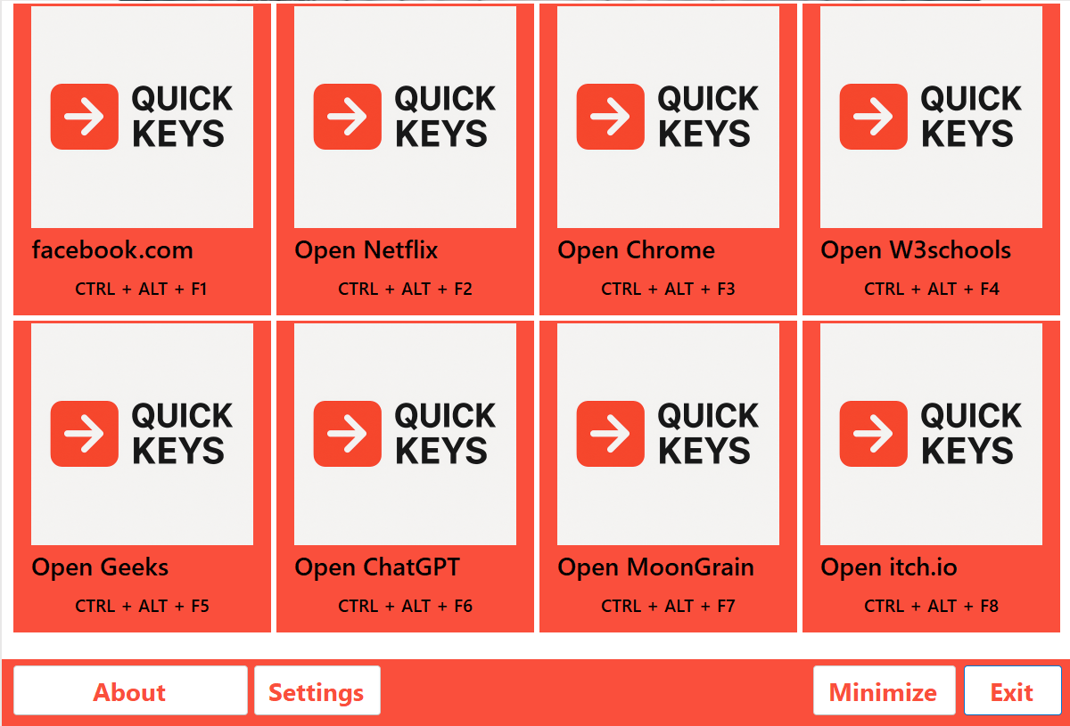 Assign keyboard combinations to open your favorite programs or websites instantly — all powered by a clean and editable JSON configuration system.